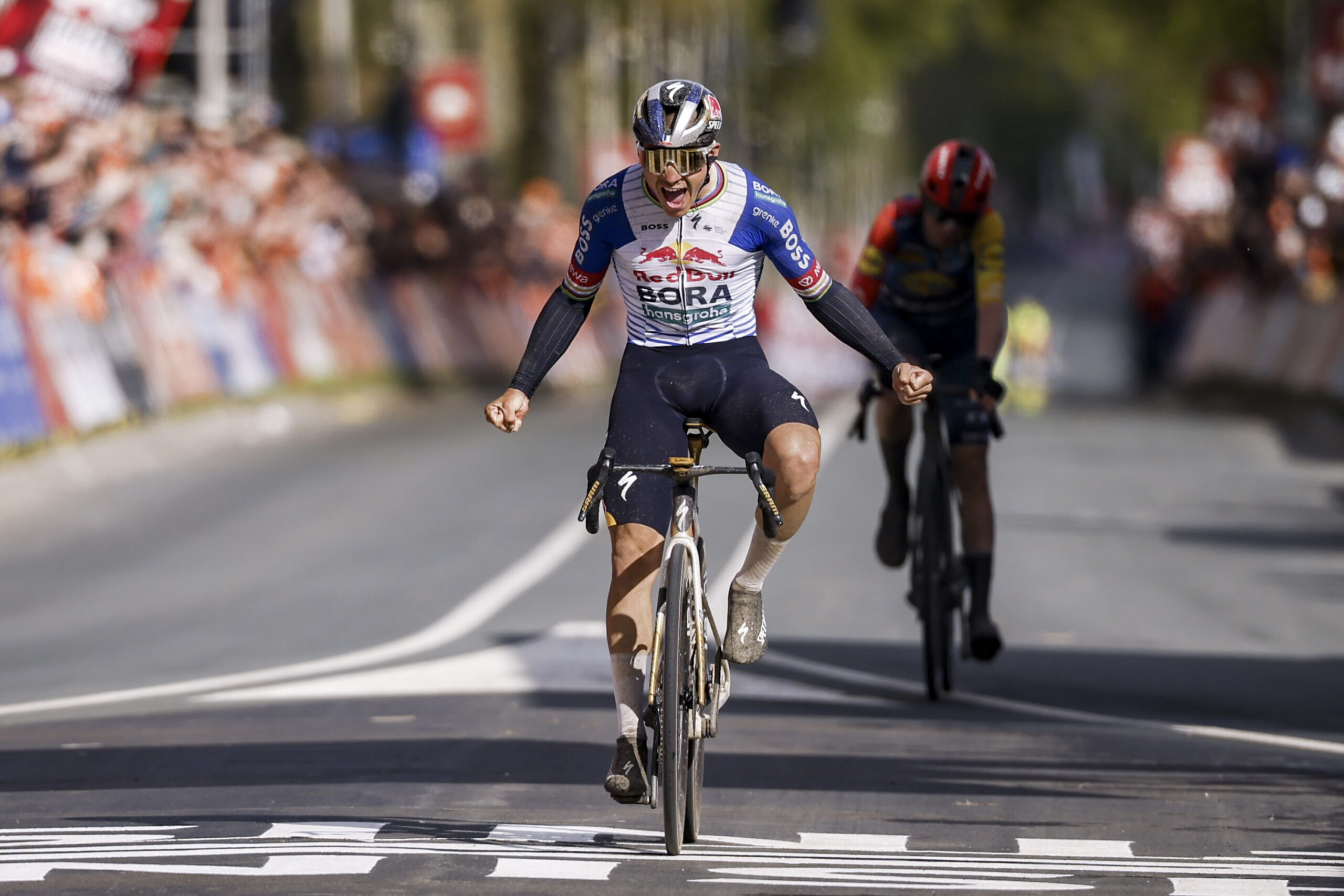 J’ai bien mieux géré mon sprint que l’an passé”, s’est félicité le double champion olympique de Paris-2024. Idéalement placé par ses équipiers de la formation Red Bull-BORA-Hansgrohe qui ont mené train d’enfer durant la première partie de course, Evenepoel n’a jamais quitté les premières places du peloton dans l’attente du final. Comme il l’avait fait 48 heures plus tôt dans le Flèche brabançonne, le Français Romain Grégoire a dynamité la course en accélérant dans le Kruisberg à 42 kilomètres de la ligne, provoquant une échappée de cinq hommes, réduite ensuite à trois unités après la chute de Kevin Vauquelin et Matteo Jorgeson quelques hectomètres plus loin.